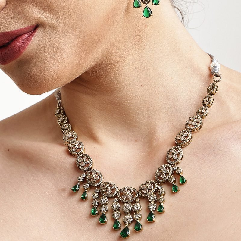 Embrace the charm of a bygone era with the American Diamond Polki Necklace Set, a timeless expression of vintage elegance and regal color. This exquisite necklace and earring duo features a sophisticated antiqued gold finish, creating a striking contrast against vibrant emerald-green teardrop stones.