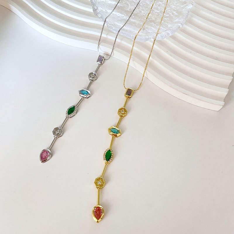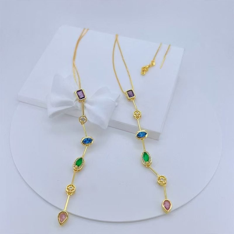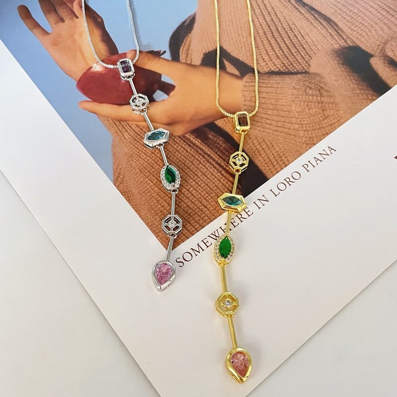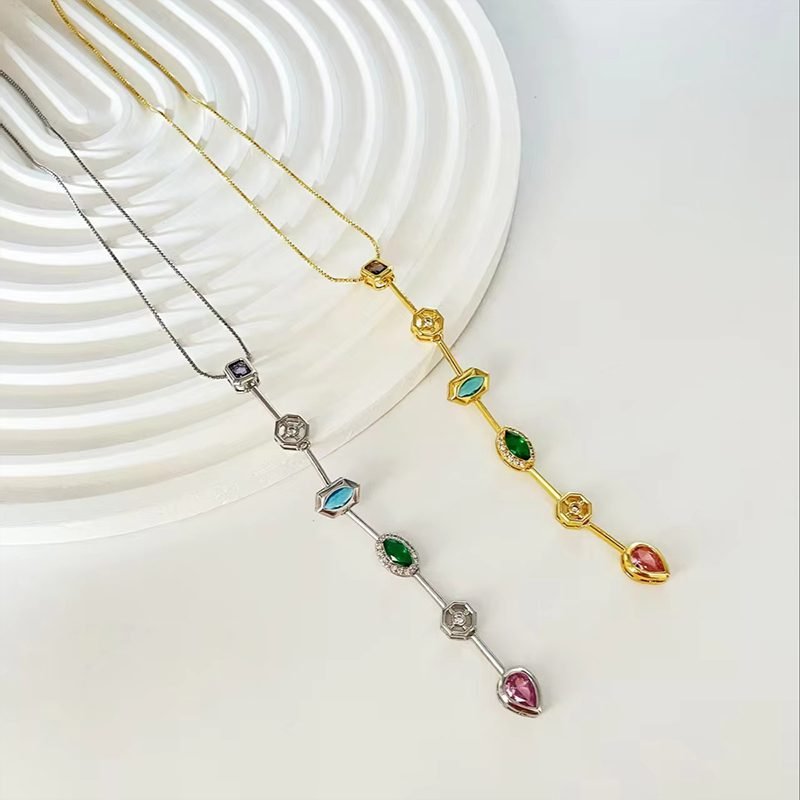 Crafted with a delicate gold-plated chain, this Multi-Gemstone Drop Pendant features a vertical design adorned with beautifully cut gemstones in vibrant colors – including deep purple, sky blue, emerald green, and blush pink tones. Each stone is elegantly framed in a minimal setting, giving the necklace a luxurious yet modern appeal.