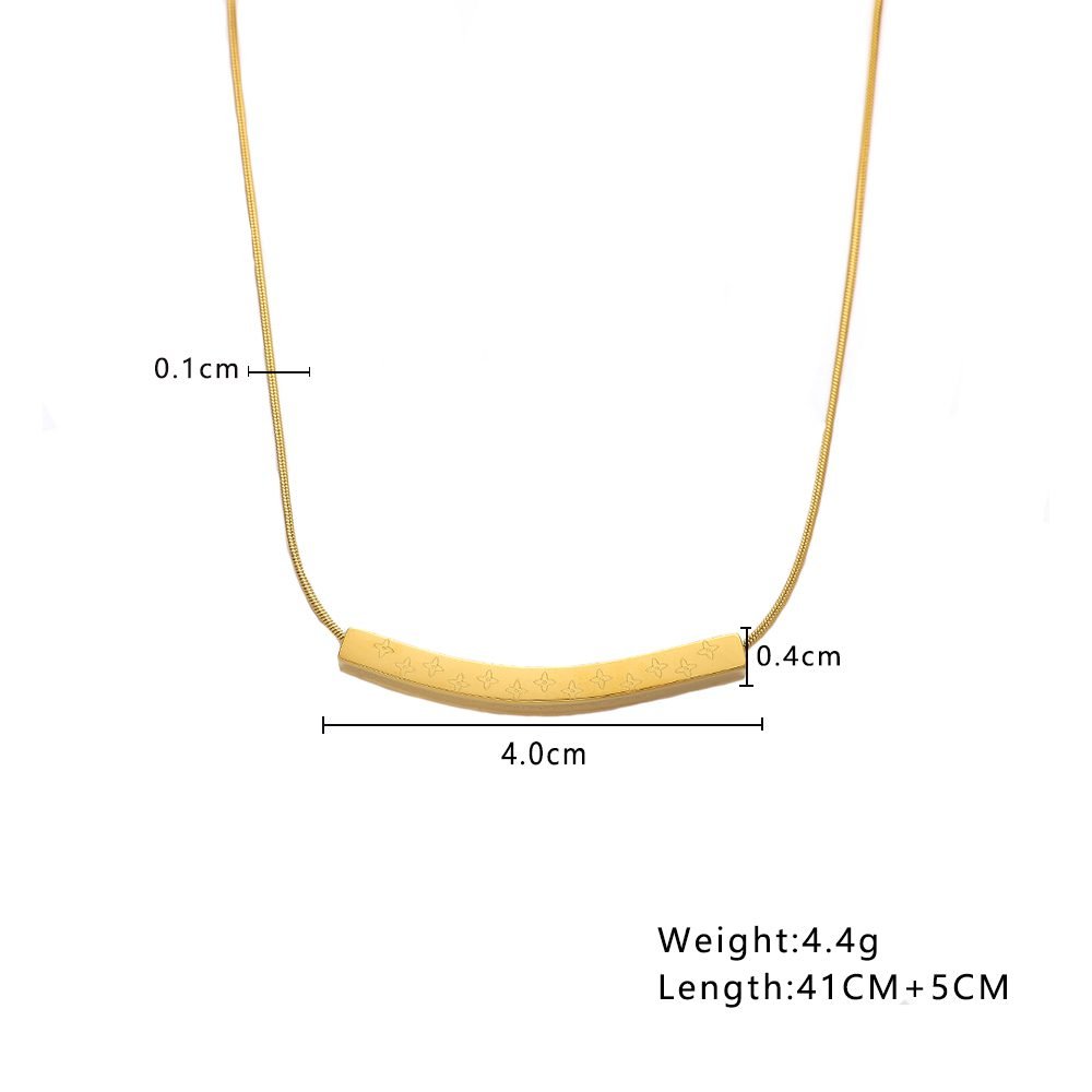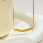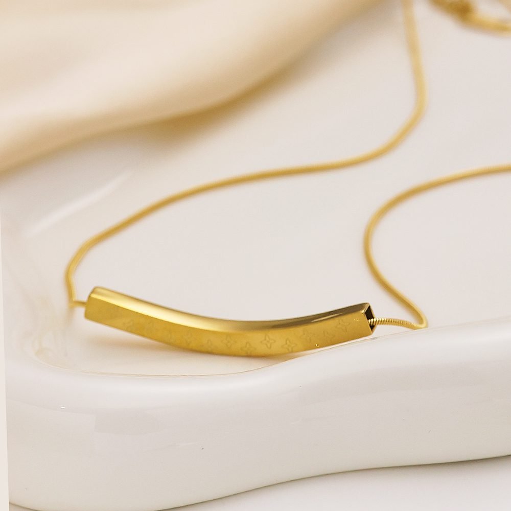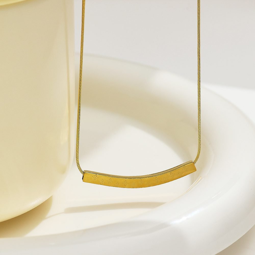 Gold-Plated Bar Pendant Necklace featuring a slim, curved bar pendant engraved with delicate star patterns. The minimalist design, paired with a smooth snake chain, creates a refined and elegant look suitable for both casual and formal outfits. This Gold Bar Pendant Necklace is perfect for those who love simple yet stylish jewelry that adds a touch of sophistication to any look.