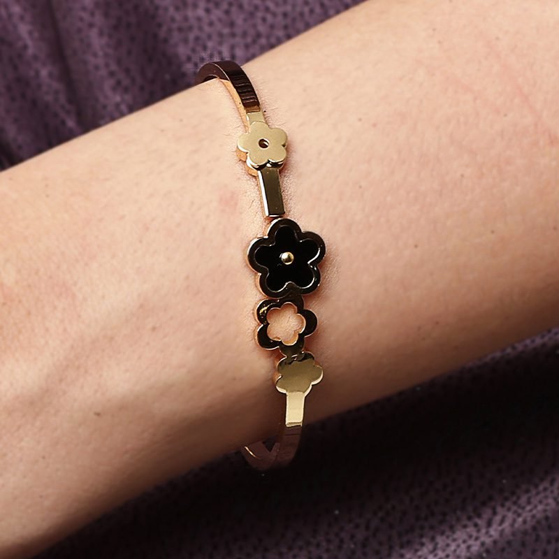 Elegant and timeless, this Gold-Tone Triple Flower Motif Bracelet features a trio of delicate flower motifs in alternating black and metallic finishes. Crafted with a polished surface and a slim, structured design, it adds a chic and feminine touch to any ensemble. Perfect for both everyday wear and special occasions, this bracelet effortlessly combines modern style with floral sophistication.