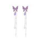 Crafted from S925 sterling silver, these earrings feature sparkling lavender crystal butterflies that shimmer with every movement, complemented by delicate pearl-accented chains for a soft, graceful flow.