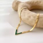 A modern and stylish gold-plated necklace featuring a bold V-Shaped Enamel Pendant Necklace accented with glossy black enamel. The pendant is seamlessly integrated into a flat, herringbone-style chain, giving it a sleek and sophisticated look. Perfect for adding a chic and trendy edge to everyday outfits or evening wear.
